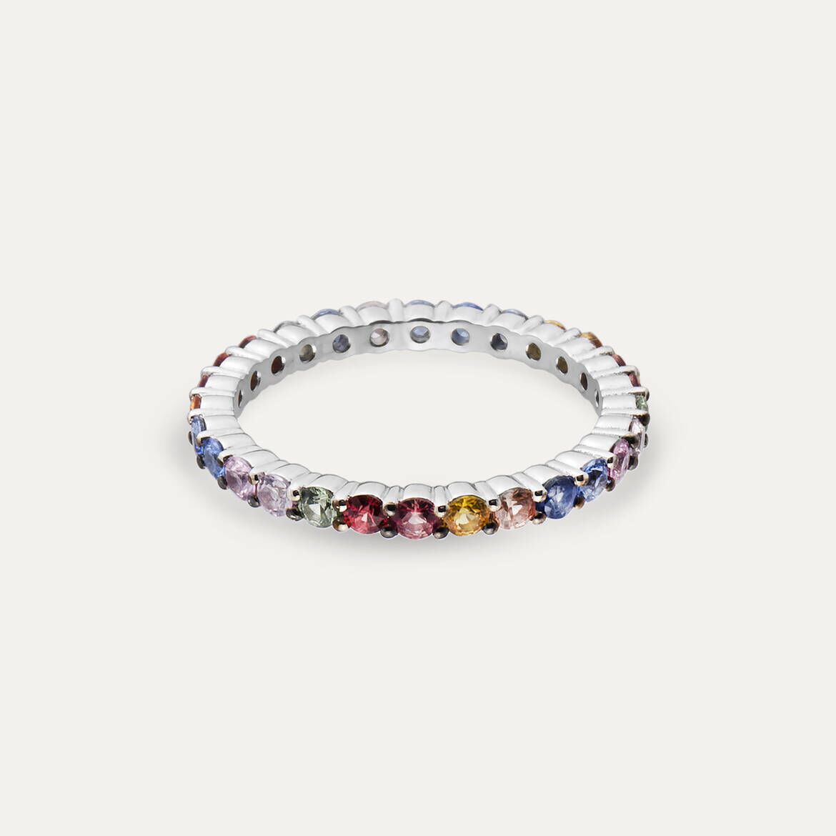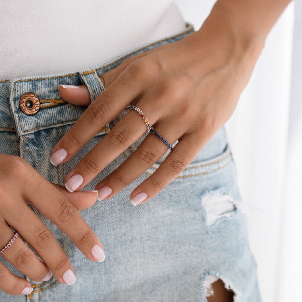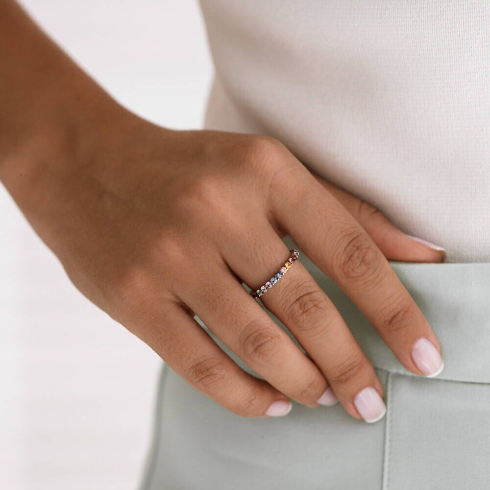 Notify me when its in stockYou can wear multicolor sapphire eternity ring with retro styel shoulder padding patterned shirts and black skinny jeans.